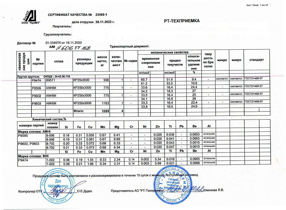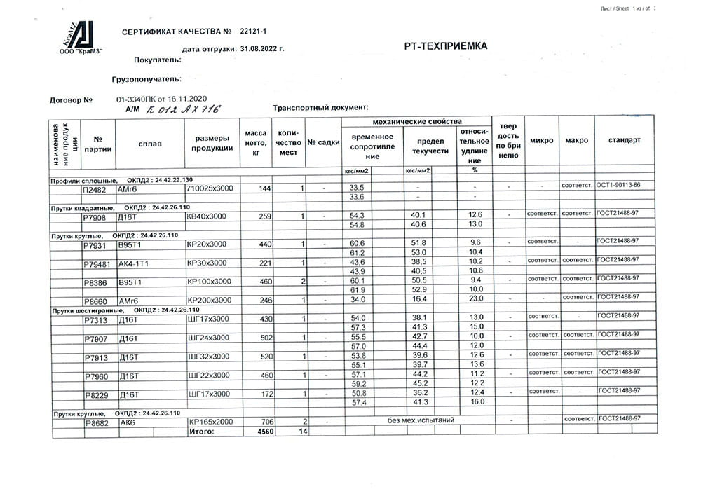 Алюминиевый круг (пруток), изготовляют по ГОСТ 21488-97, отбор и подготовка проб для определения химического состава сплава по ГОСТ 24231-80. Овальность, косину реза, кривизну и скручивание проверяют по ГОСТ 26877-91. Используется при изготовлении сварных конструкций, крепежных изделий.